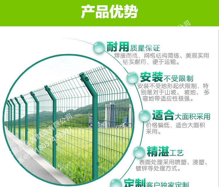 1. 產(chǎn)品結(jié)構(gòu)簡單用料少,因而工程造價低; 2. 十分便于遠(yuǎn)程運(yùn)輸; 3. 將圍網(wǎng)底部與磚混墻筑為一體,有效克服了該網(wǎng)剛度不足的弱點(diǎn),增強(qiáng)了防護(hù)性能; 4. 安裝不受地形地勢影響,特別適合丘陵地區(qū); 5. 熱鍍鋅防腐使用壽命長 主要市場高爾夫場/滑雪場圍網(wǎng)封山開發(fā)保護(hù)地種植農(nóng)業(yè)開發(fā)區(qū)圍界道路交通封閉,臨時使用護(hù)欄網(wǎng)。